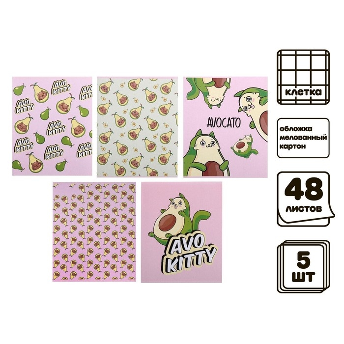 Комплект тетрадей из 5 штук, 48 листов в клетку Calligrata "Авокато", обложка мелованный картон, блок офсет