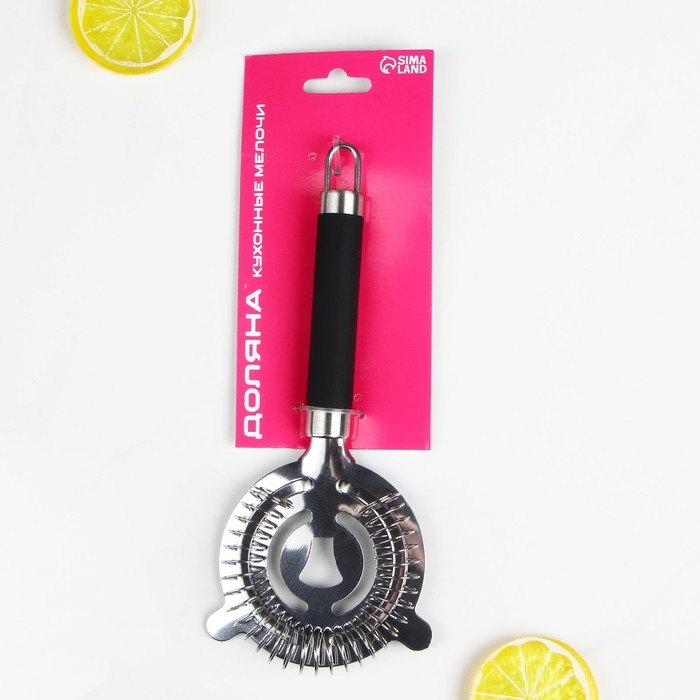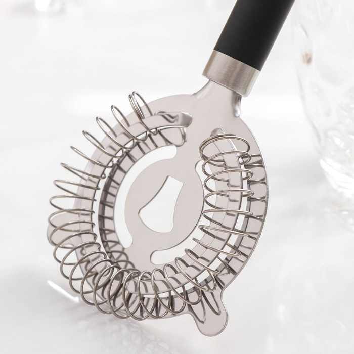 Основное отличие стрейнера от обычного ситечка — скрученная в пружину проволока. Благодаря ей крупные кусочки фруктов остаются в стрейнере, а мякоть и мелкие частички льда попадают в коктейль.