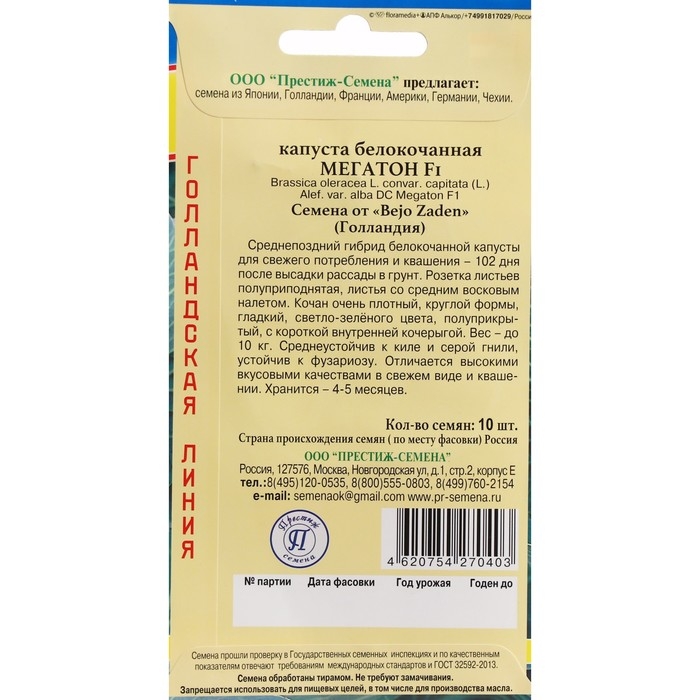 Семена Капусты белокочанной "Мегатон", F1, 10 шт.
