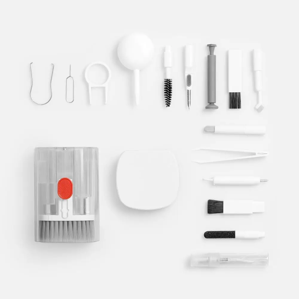 - В комплекте: большая щетка, салфетка для ухода за дисплеем, контейнер для жидкости, пластиковый пинцет, щетка с жесткой щетиной, щетка с мягкой щетиной, чистящее перо со щеткой для наушников, насадка для чистки кейса от наушников, ершик для чистки кейса от наушников, щетка с короткой щетиной, щетка с наклонной щетиной, двусторонняя насадка для чистки разъемов зарядки, двусторонняя насадка для чистки камеры, инструмент для продувки, дуговой пинцет, ключ для отсека SIM-карты, инструмент для извлечения поврежденных ключей