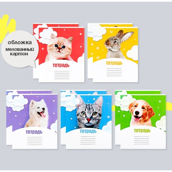 Комплект тетрадей из 10 штук, 12 листов в клетку Calligrata "Домашние животные", обложка мелованный картон, ВД-лак, блок офсет, 5 видов по 2 штуки