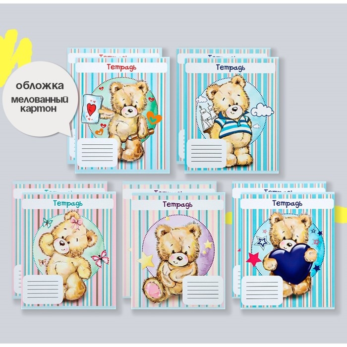 Комплект тетрадей из 10 штук, 12 листов в клетку Calligrata "Мишки", обложка мелованный картон, ВД-лак, блок офсет, 5 видов по 2 штуки