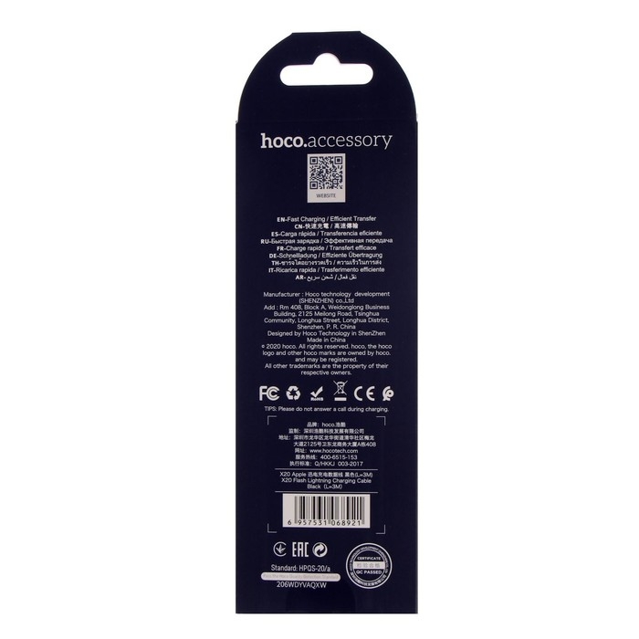 Кабель Hoco X20, Lightning - USB, 2 А, 3 м, PVC оплетка, чёрный