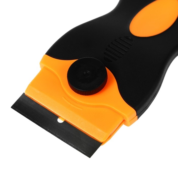 Скребок со сменным лезвием для удаления остатков клея и тонировочной пленки со стекол автомобиля. Может использоваться в бытовых целях для очистки от загрязнений стеклокерамики, варочных панелей и прочих ровных поверхностей.