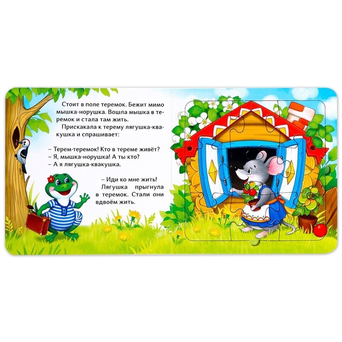 В этой чудной книге малыша ждёт не только русская народная сказка про теремок, но и пазлы. Собирайте их вместе с малышом, чтобы потренировать мелкую моторику и привить любовь к чтению.