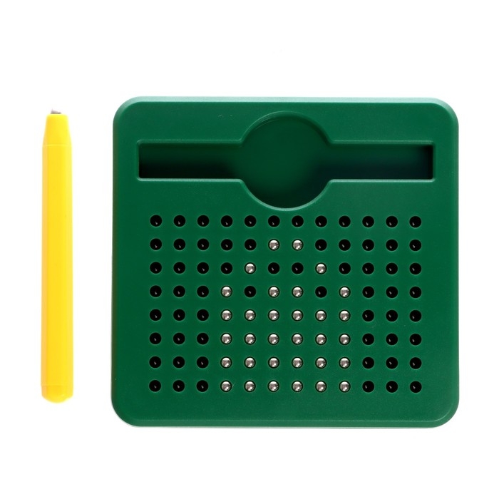 Мини планшет обучающий «Магнитное рисование» зелёного цвета с 96 отверстиями станет отличным инструментом для развития фантазии и координации у детей. Этот планшет позволяет создавать разнообразные изображения с помощью магнитного стилуса и металлических шариков, превращая обучение в увлекательную игру.