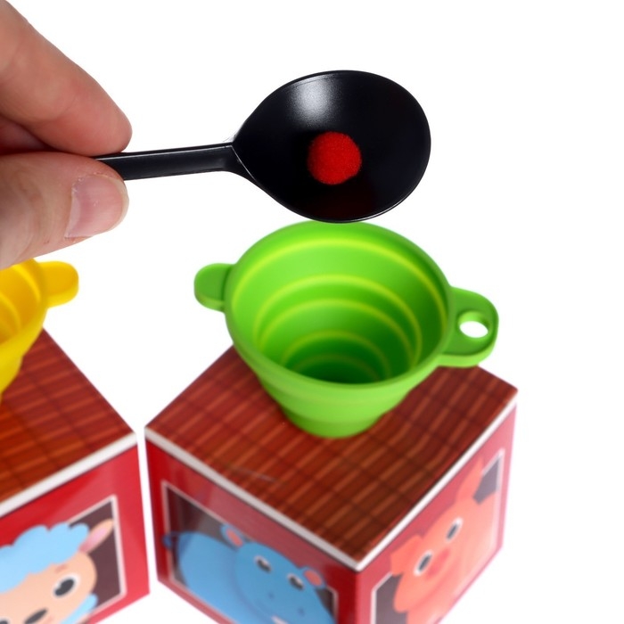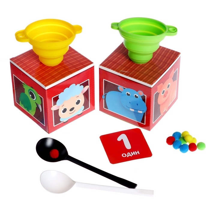 Вставьте воронки в коробочки со зверушками и покормите их с ложечки.