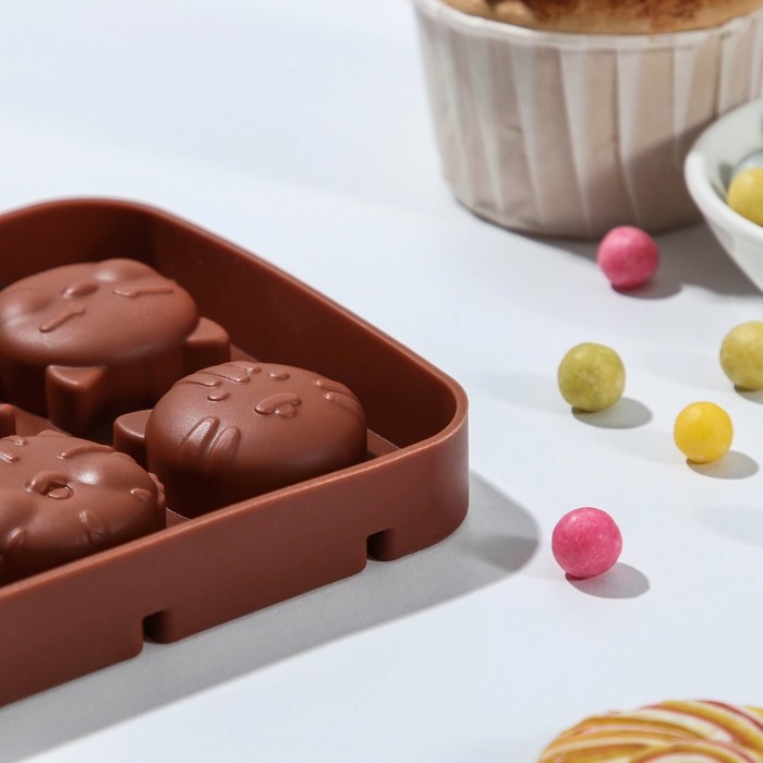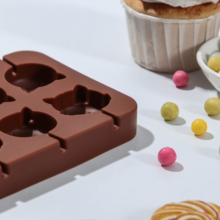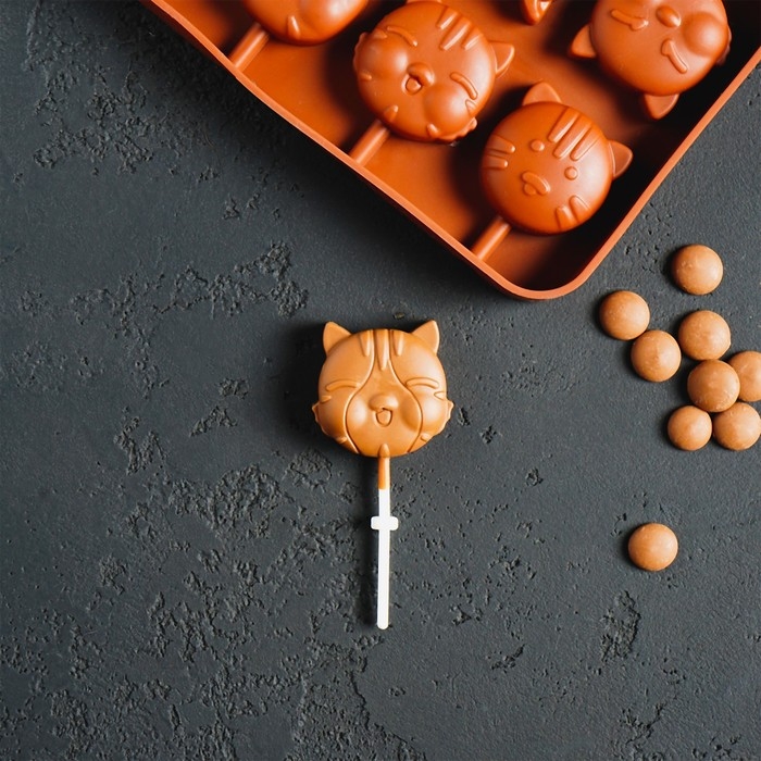 Форма для леденцов «Котики», силикон, 16,5×11×1,7 см, 8 ячеек, с палочками, цвет коричневый