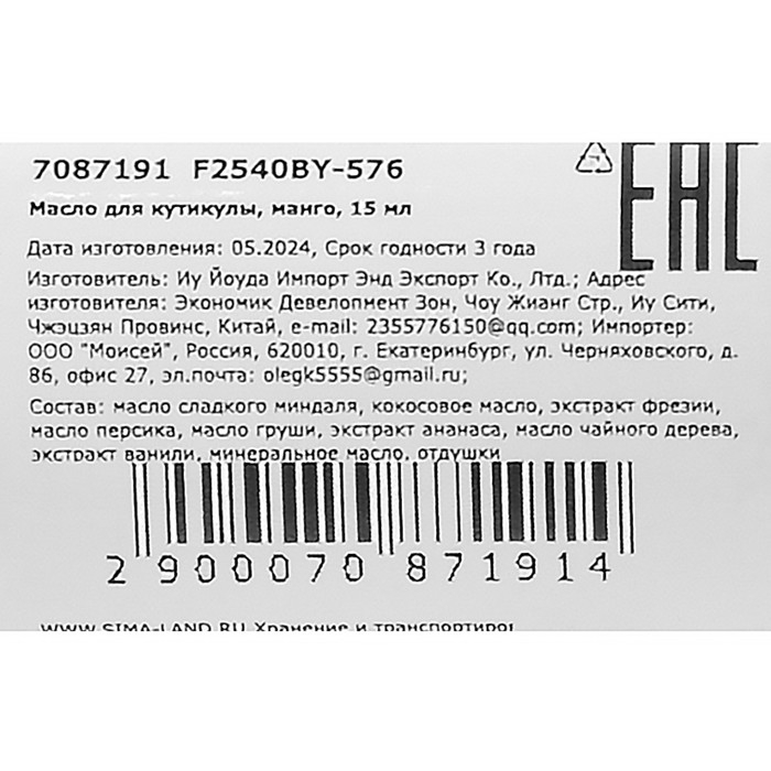 Масло для увлажнения и питания кутикулы 15 мл, манго