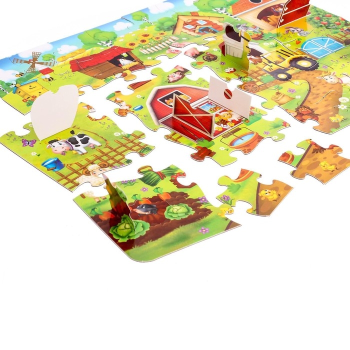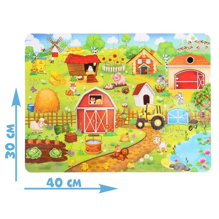 В коробке 28 деталей, детали двух разных размеров. Обычные маленькие и большие детали с окошками внутри. Собрав все детали вы получите картинку размером 40 × 30 см.