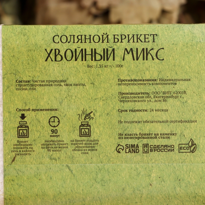 Применение: нагревайте брикет на печи не менее 90 минут, затем поддайте на него горячей воды. Соль наполнит воздух бани ионами, тем самым поможет снять усталость, улучшить кровообращение и общее самочувствие.