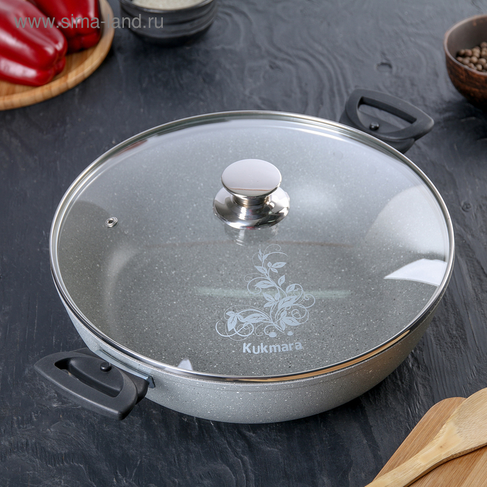 Посуда Kukmara «Мраморная» изготовлена из литого алюминия и покрыта инновационным антипригарным мраморным покрытием на водной основе, усиленным сверхтвёрдыми частицами минералов.