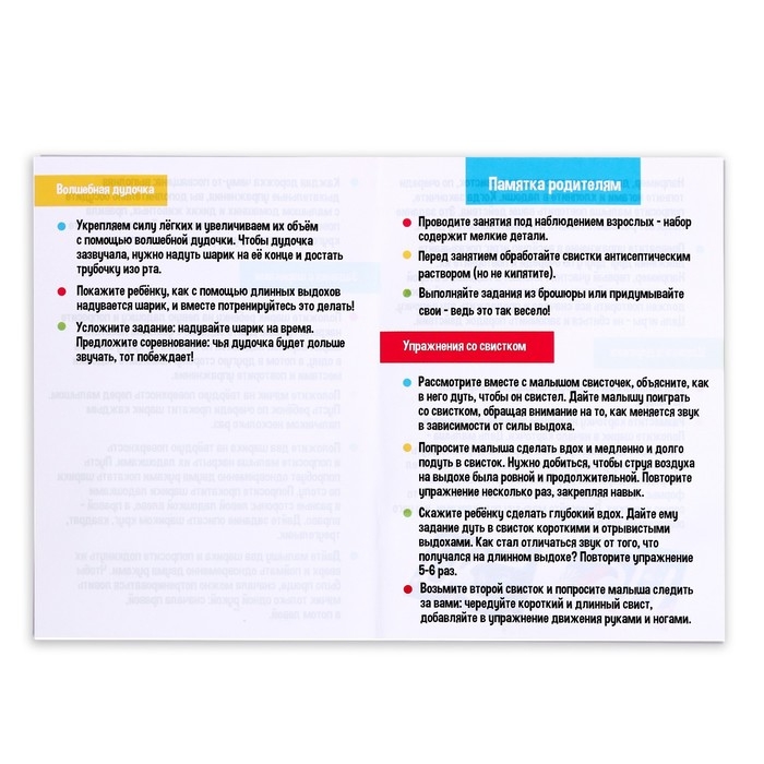 Перед использованием тщательно протрите дыхательный тренажёр. Не кипятить. Играть следует под присмотром взрослого человека.