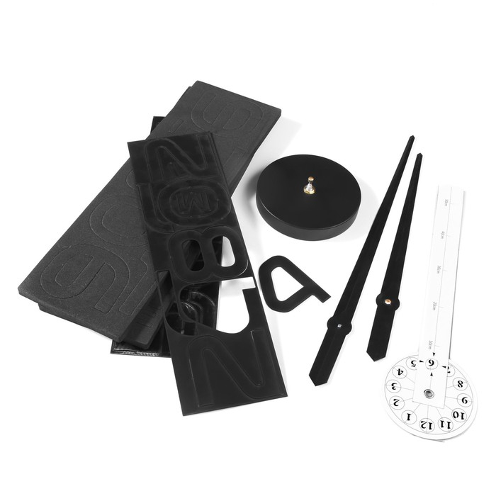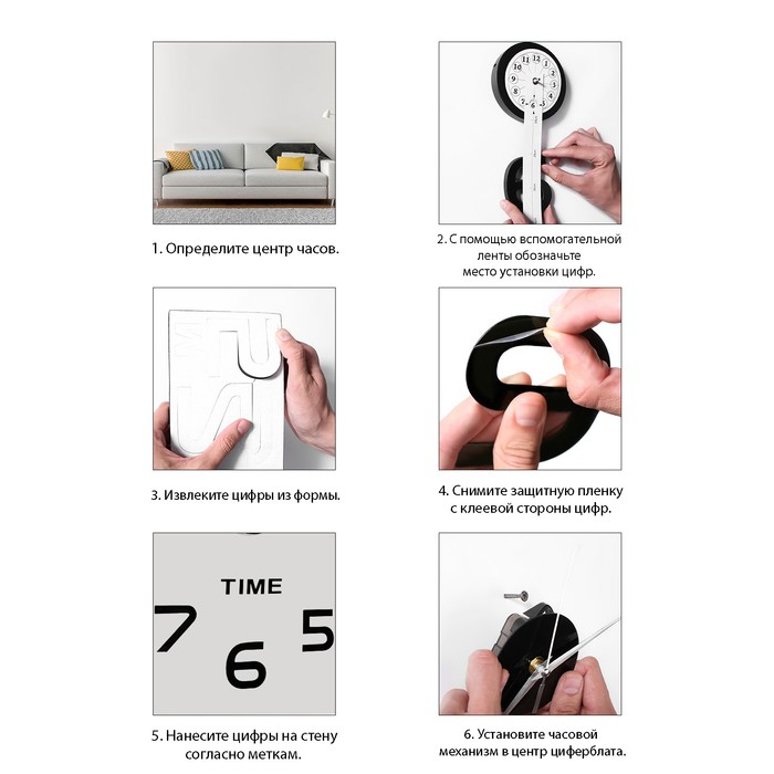 Создавайте часы в собственном стиле, проявляйте изобретательность и креативность. Не обязательно располагать числа по кругу — придайте аксессуару необычную форму, поменяйте диаметр циферблата, используйте не все элементы. Комплектующие легко клеятся на стену и без труда снимаются.