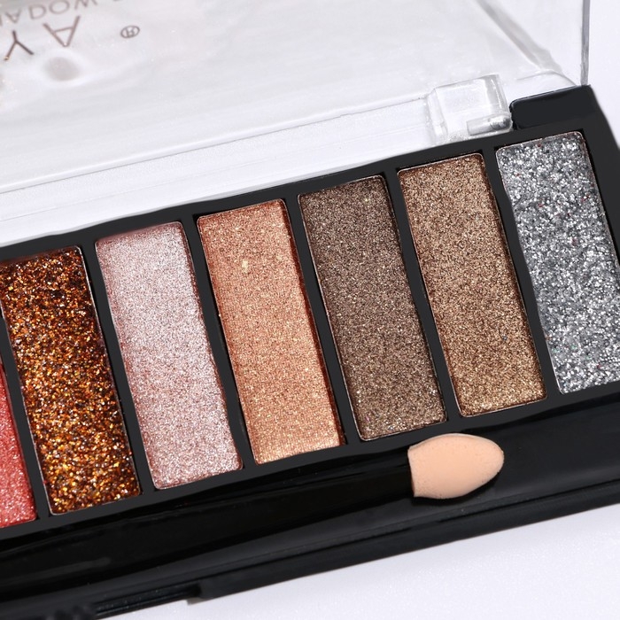 Палетка теней имеет удобную форму и хороший выбор цветов, в том числе блестящих. Тени хорошо пигментированы, не пылят, не скатываются, отлично тушуются и наносятся на веки.
