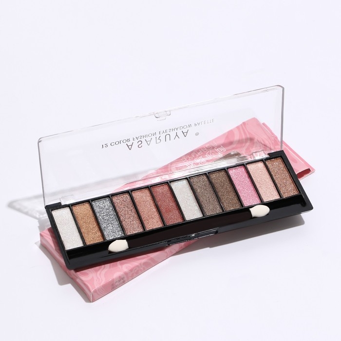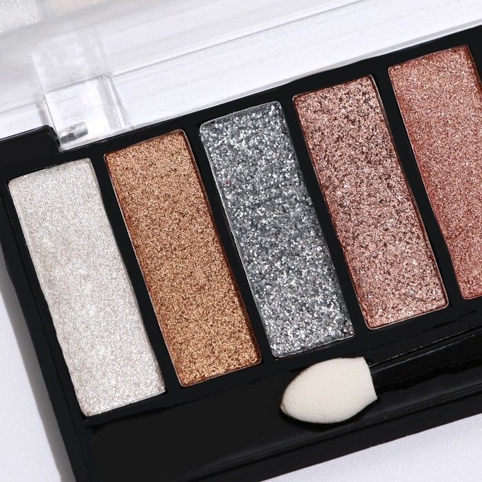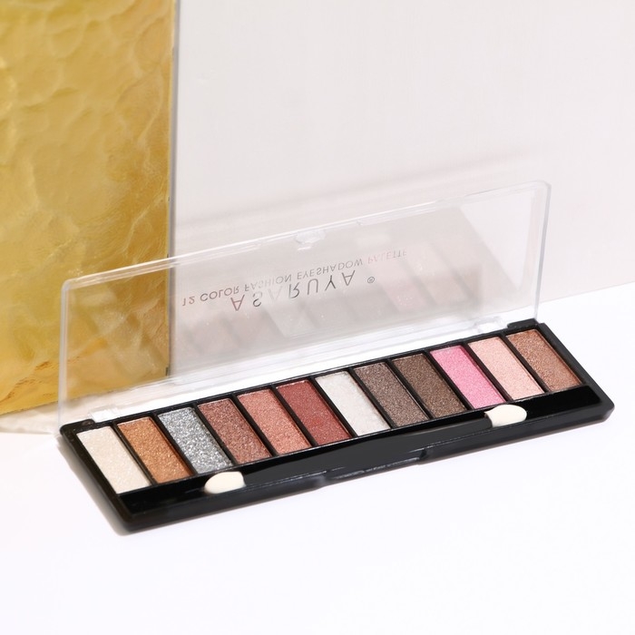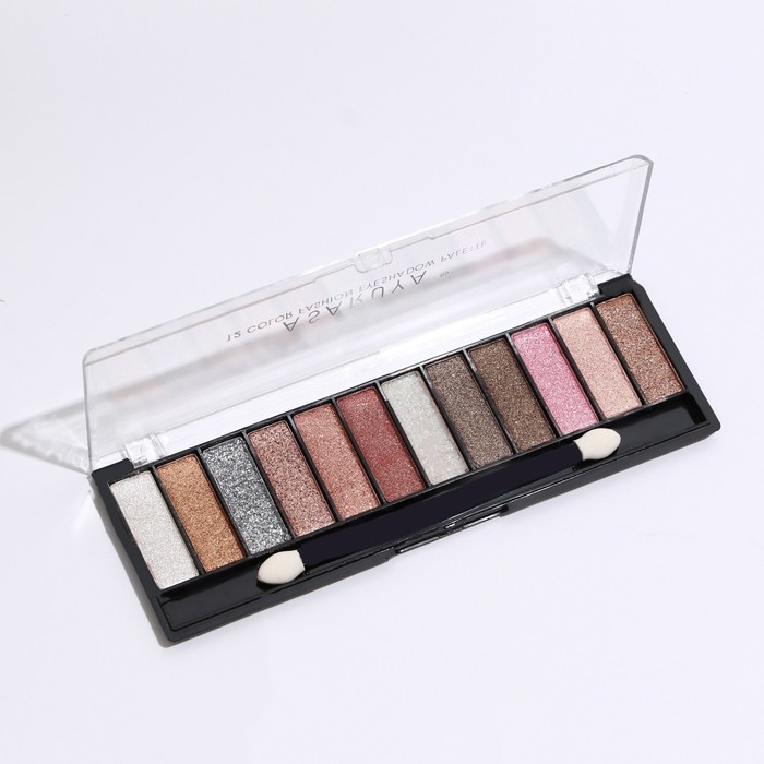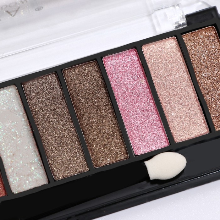 Палетка теней имеет удобную форму и хороший выбор цветов, в том числе блестящих. Тени хорошо пигментированы, не пылят, не скатываются, отлично тушуются и наносятся на веки.