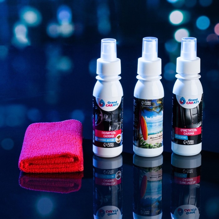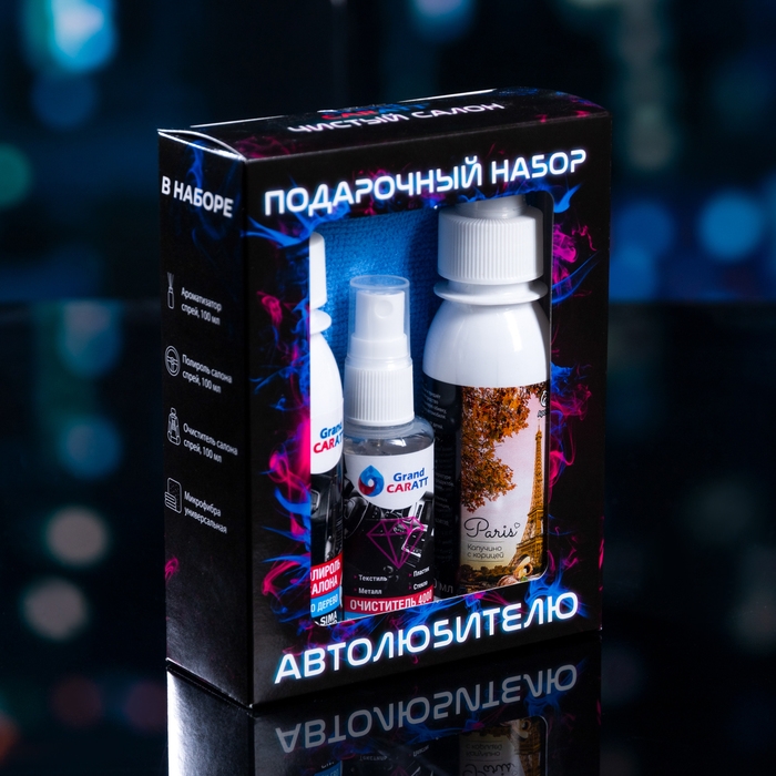 Подарочный набор автолюбителю Grand Caratt black, Чистый салон: ароматизатор-спрей 100 мл, полироль салона 100 мл, очиститель салона 100 мл, микрофибра