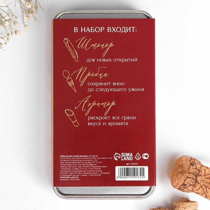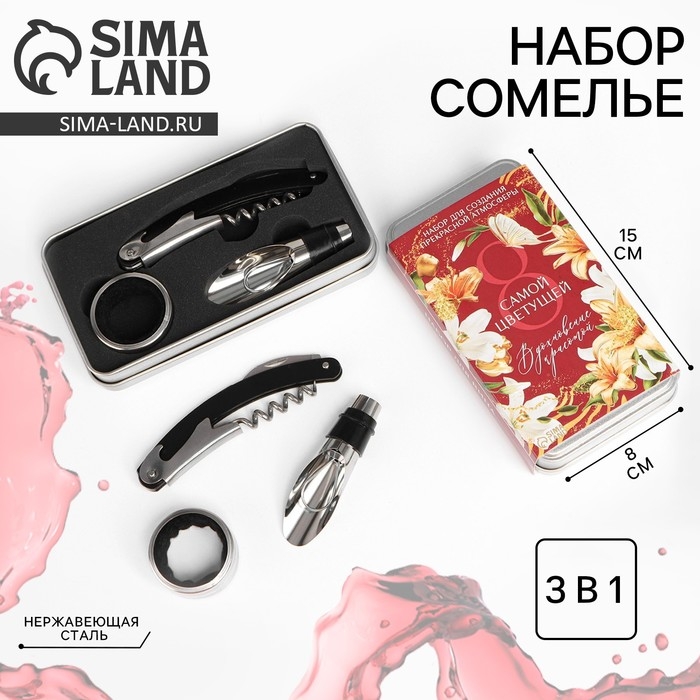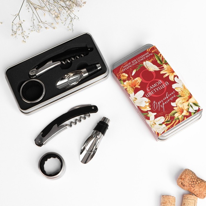 Подарочный набор сомелье «Самой цветущей»: штопор, пробка, каплеуловитель для вина