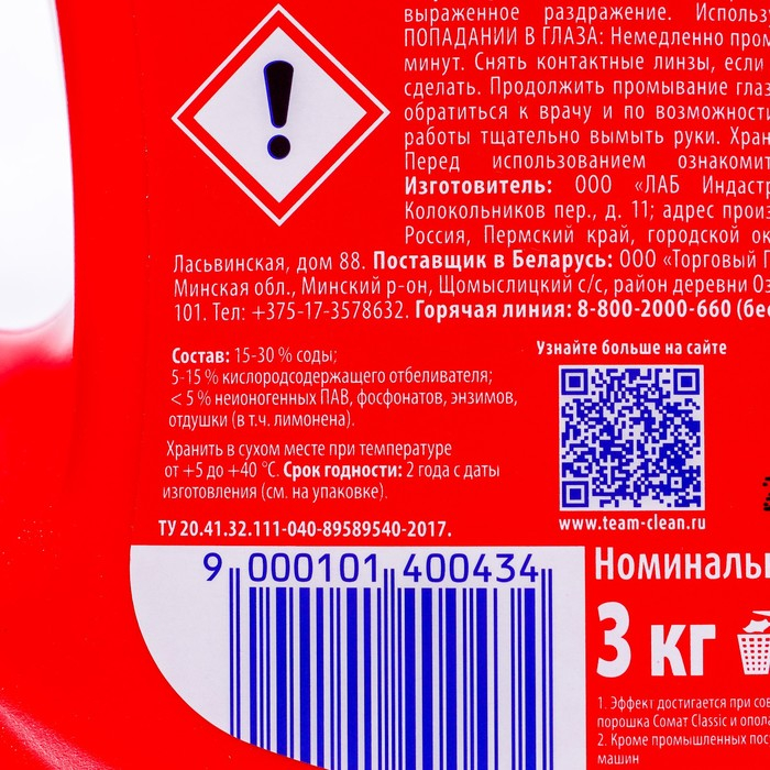 Состав: ≥ 30 % сульфата натрия; 15-30 % соды; 5-15% кислородосодержащего отбеливателя; < 5 % неионогенных ПАВ, фосфонатов, энзимов, отдушки (в т.ч. лимонена), активатора отбеливателя