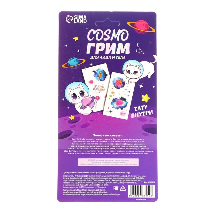 Грим для лица — это декоративная косметика, которая позволит ребёнку мгновенно перевоплотиться в персонажа на свой вкус. А взрослые с его помощью смогут создать неповторимый образ для любого праздничного случая: дня рождения, Хеллоуина, Дня России или тематической вечеринки. В набор входят переводные татуировки для создания уникального и стильного образа. Набор состоит из 6 цветных карандашей и 6 красок для тела.