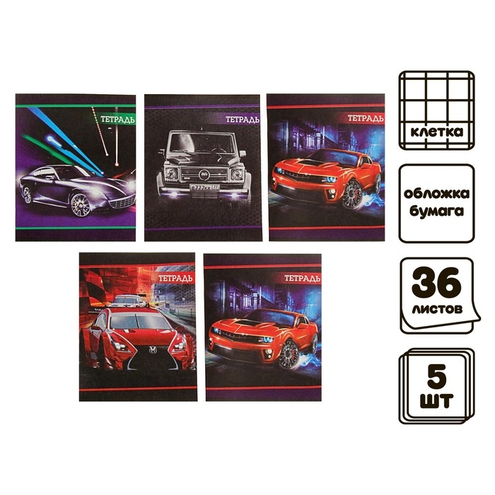 Комплект тетрадей из 5 штук (4 разные + 1 повторяющаяся), 36 листов в клетку Calligrata "Авто-2", обложка мелованная бумага, блок №2, белизна 75% (серые листы)
