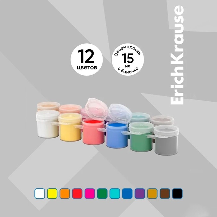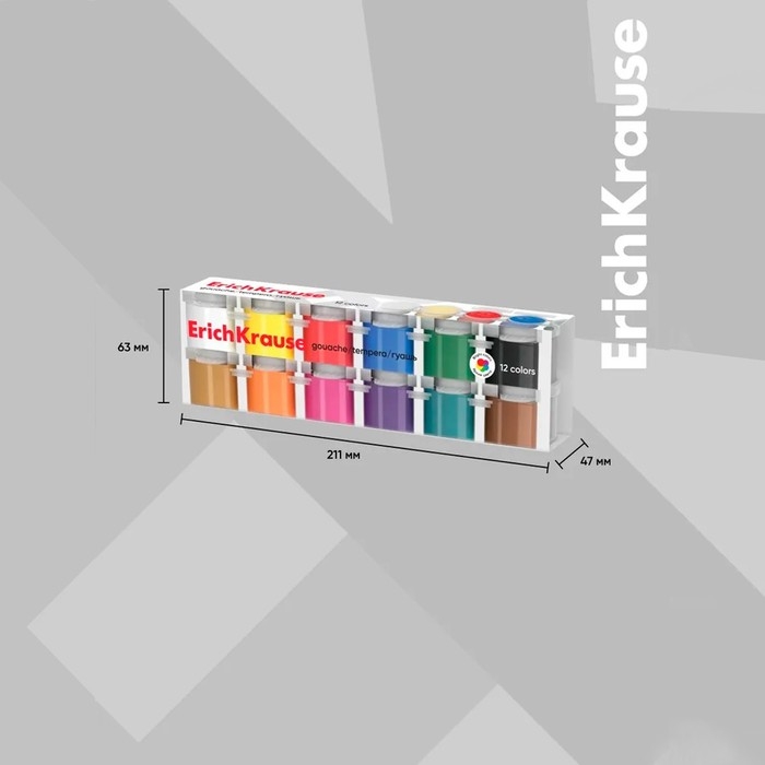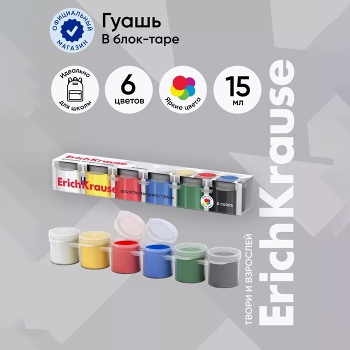 - Безопасная гуашь ErichKrause® на водной основе, легко смывается с рук и отстирывается с большинства видов ткани и бытовых поверхностей, она не токсична, изготавливается из экологичных материалов.