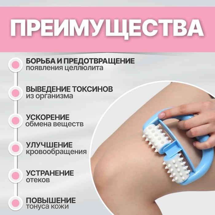 Роликовый массажёр разомнёт и разогреет мышцы, улучшит кровообращение и приведёт кожу в тонус. Изделие дарит чувство расслабления, борется с целлюлитом и предотвращает его появление. Подойдет для любой части тела, которой необходимо снятие напряжения или лифтинг-эффект. Массаж способствует ускорению обмена веществ, похудению, также помогает вывести токсины из кожных покровов. Благодаря регулярному использованию, кожа заметно улучшается, а тело становится более подвижным, гибким и отдохнувшим. Инструмент удобно лежит в руке и прослужит вам очень долго.