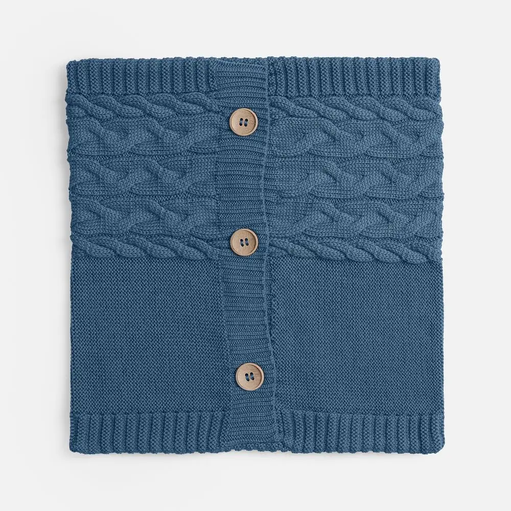 Вязаный чехол надевается на подушку из спанбонда, наполнитель — синтепон. Чехол крепится на три пуговицы.