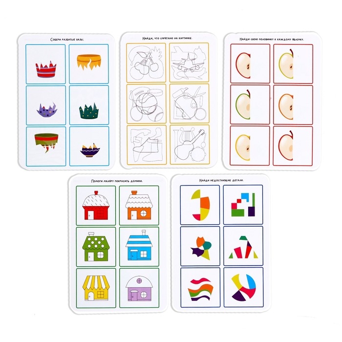 В наборе представлены большие карточки-основы, где малыш будет выполнять задания, и прозрачные карточки-дополнения. По цвету каёмки вы с малышом определите, какие карточки составляют одно задание.