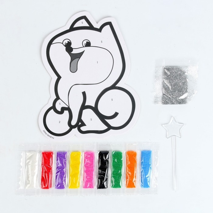 Фигурная фреска — увлекательный вид творчества, который понравится любому малышу. Клеевая основа защищена специальным слоем бумаги, на который нанесены прорезные контуры. Каждый цвет находится в своей зоне: отделяйте верхний слой с помощью стеки и засыпайте песком подходящего оттенка. Специальные контуры не дадут разноцветным частичкам перемешаться и помогут с лёгкостью создать сверкающий шедевр. Засыпайте картинку постепенно и не забывайте распределять мелкие блёстки по клеевому слою, чтобы добиться особой яркости изображения.