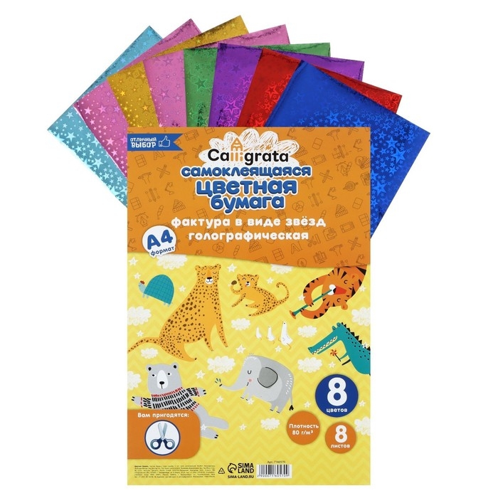 Набор бумаги голографической самоклеящейся "Звезды" А4, 8 листов, 8 цветов, рисунок, 80 г/м2