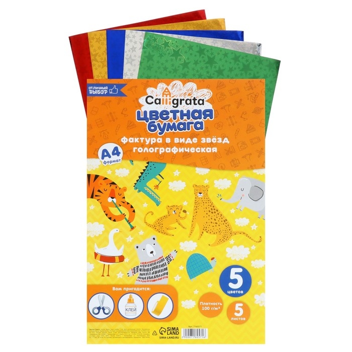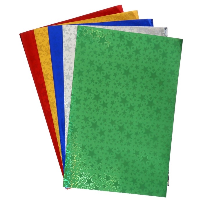 Набор бумаги голографической "Звезды" А4, 5 листов, 5 цветов, рисунок, 100 г/м2