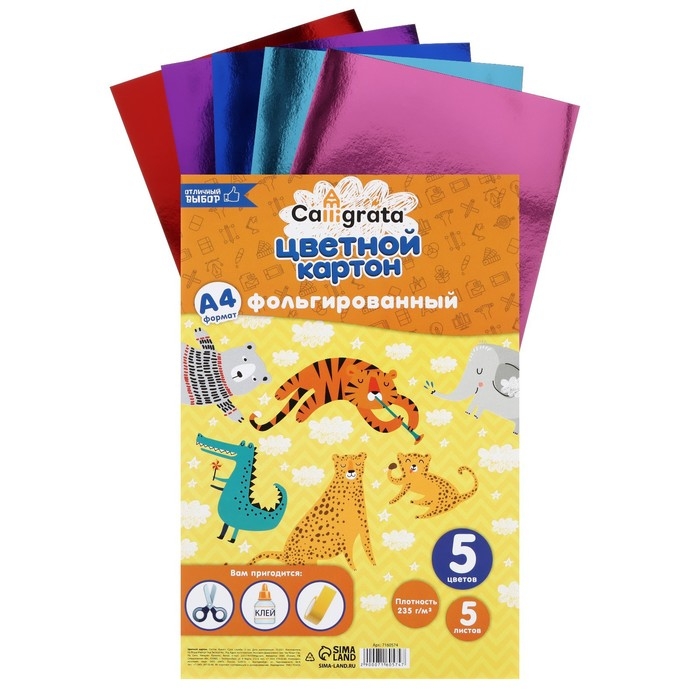 Картон фольгированный А4, 5 листов, 5 цветов, 235 г/м2