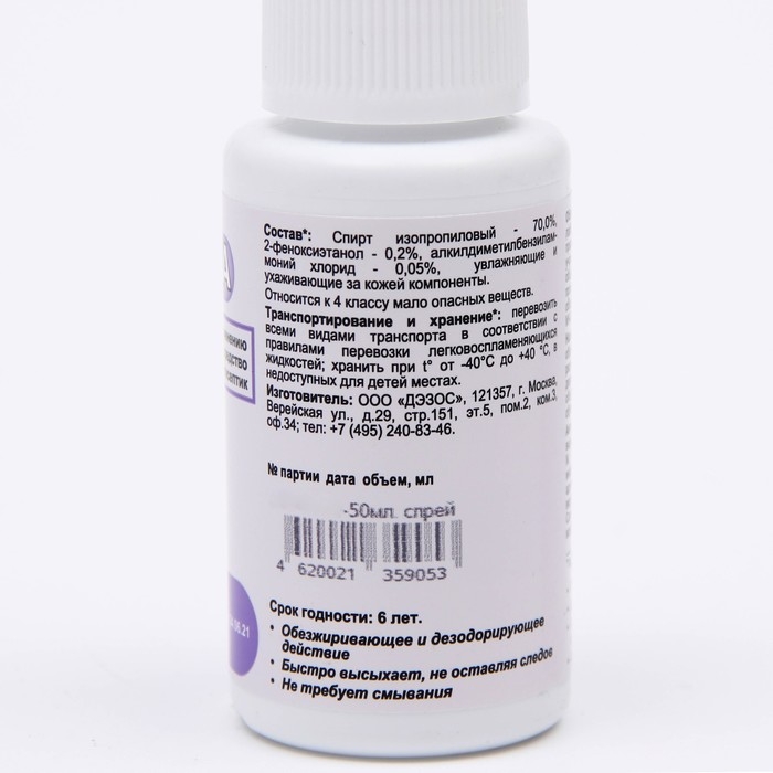 Состав: спирт изопропиловый – 70,0%, 2-феноксиэтанол – 0,2%, алкилдиметилбензиламмоний хлорид – 0,05%, а также функциональные добавки, увлажняющие и ухаживающие за кожей компоненты.