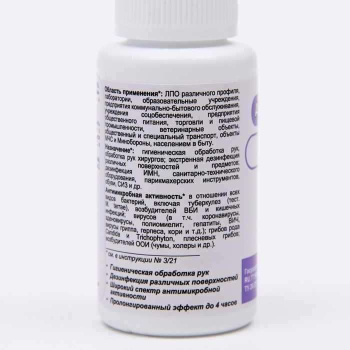 Для дезинфекции небольших по площади и/или труднододоступных поверхностей и предметов, ИМН, для гигиенической обработки рук и обработки рук хирургов, обработки кожи инъекционного и операционного поля, локтевых сгибов доноров, санитаризации кожных покровов и обеззараживания СИЗ.