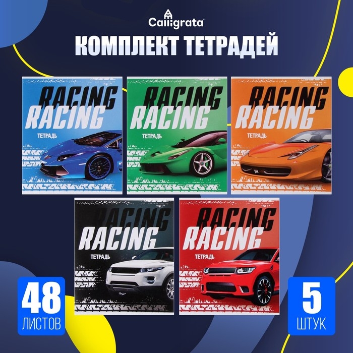 Комплект тетрадей из 5 штук (4 разные + 1 повторяющаяся), 48 листов в клетку Calligrata "Racing defender", обложка мелованная бумага, блок №2, белизна 75% (серые листы)