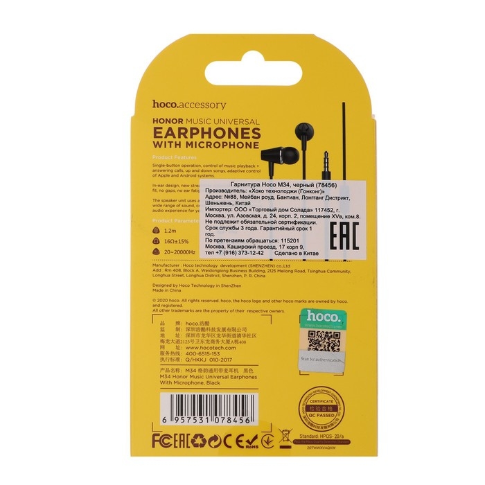 Наушники Hoco M34, проводные, вакуумные, микрофон, Jack 3.5 мм, 1.2 м, черные