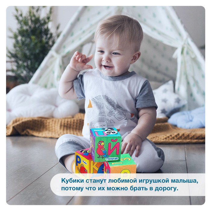 Мягкие кубики способствуют развитию тактильного восприятия, знакомят малыша с первыми животными и окружающим миром. Игрушки выполнены из безопасных и безвредных материалов: верх из трикотажного текстиля, наполнитель из синтепона.