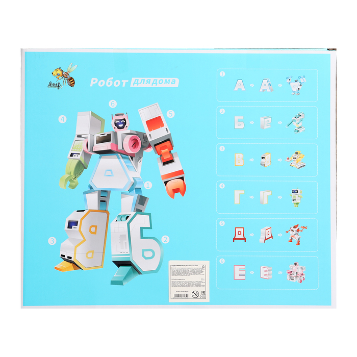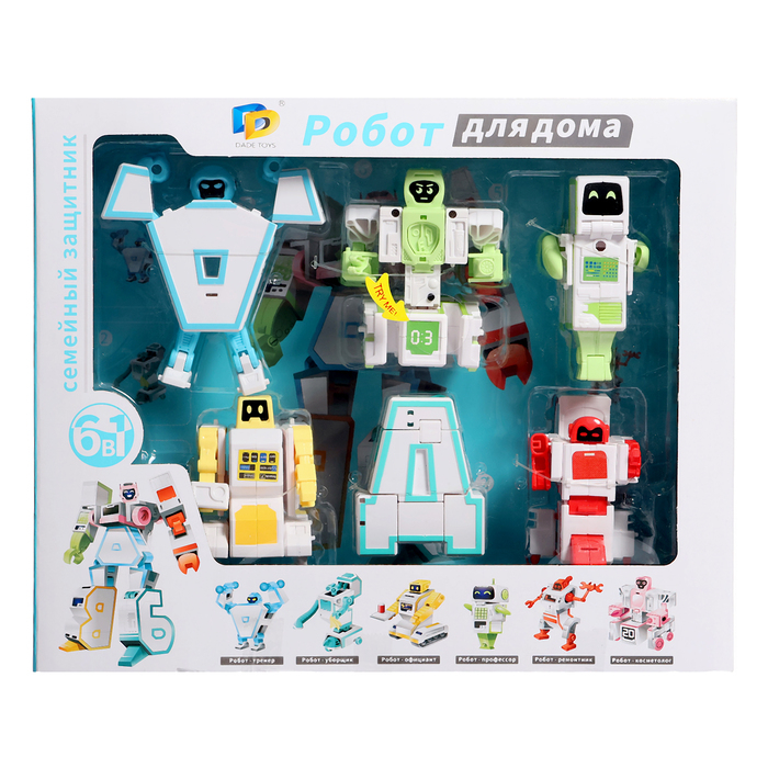 - В наборе 6 роботов, каждый из них может трансформироваться в букву. Робот-косметолог — буква «Е», робот-тренер — «А», робот-профессор — «Г», робот-официант — «В», робот-ремонтник — «Д» и робот-уборщик — «Б».