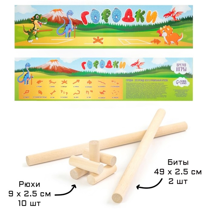 Игра городки "Время игры. Динозавры", биты 2 шт 49 х 2.5 см, городки 10 шт 9 х 2.5 см
