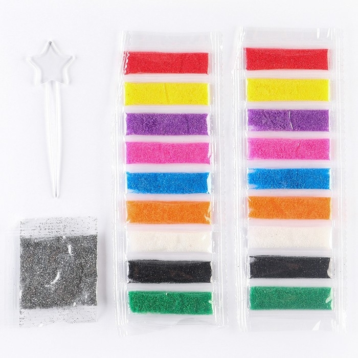 Фреска песком — увлекательный вид творчества, который понравится ребёнку. Клеевая основа защищена специальным слоем бумаги, куда нанесены прорезные контуры. Каждый цвет находится в своей зоне: отделяйте верхний слой с помощью стеки и засыпайте элементы песком или блёстками. Затем прикрепите магнит к обратной стороне рисунка.