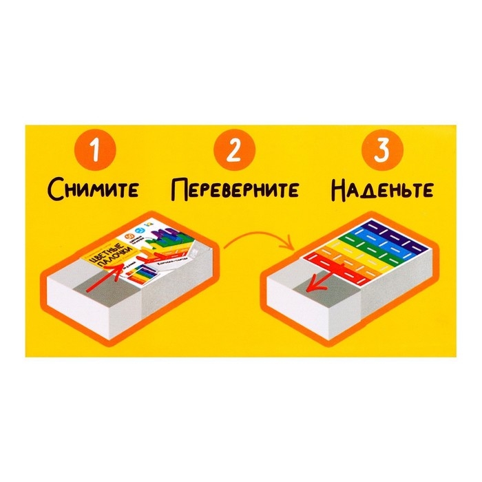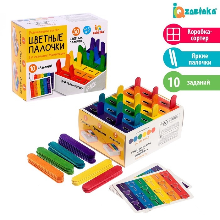 Внутри вы найдёте коробку-сортер, 50 цветных палочек и 10 заданий.