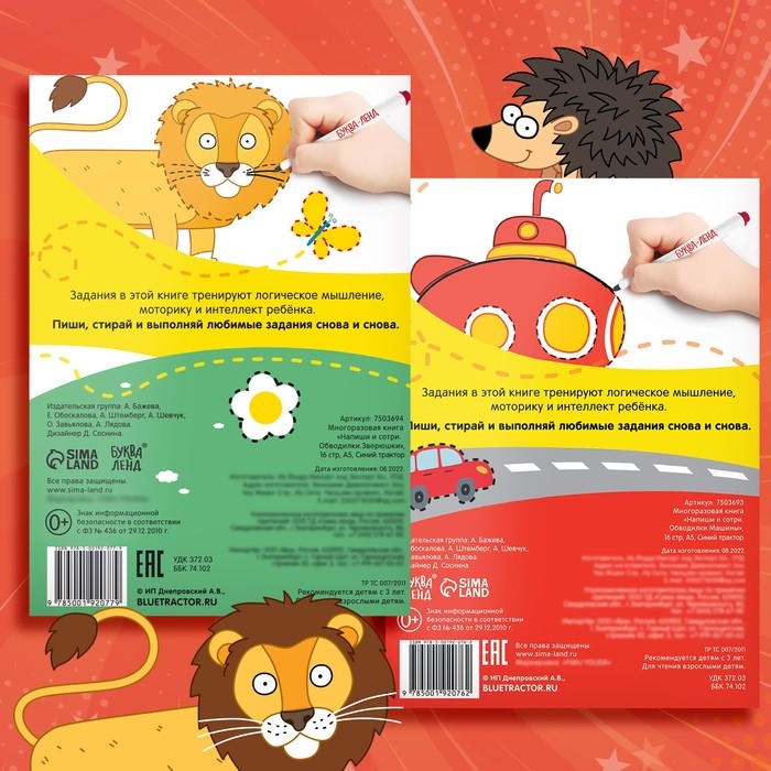 Многоразовая книга «Напиши и сотри. Обводилки.Зверюшки», 16 стр., А5, + маркер, Синий трактор