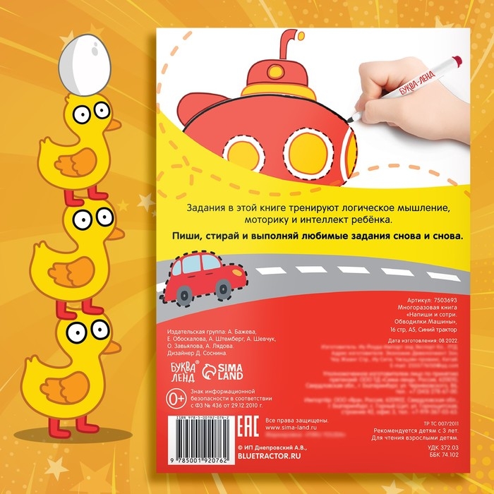 Многоразовая книга «Напиши и сотри. Обводилки.Машины», 16 стр., А5, + маркер, Синий трактор