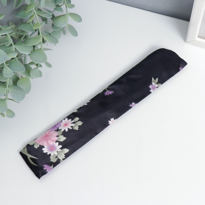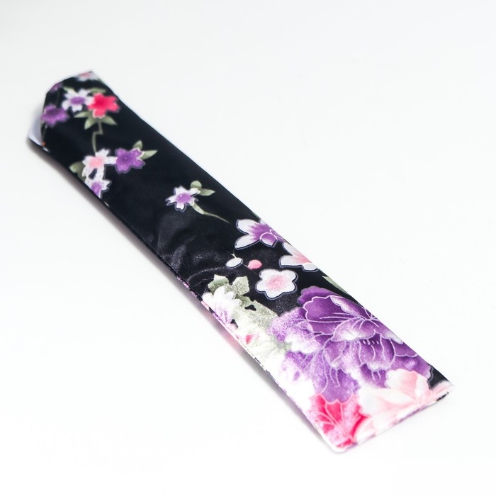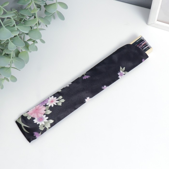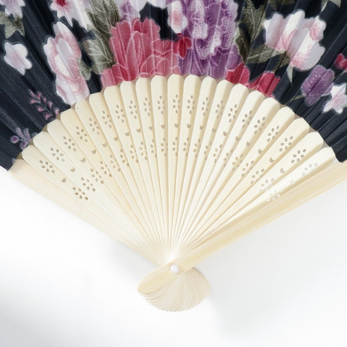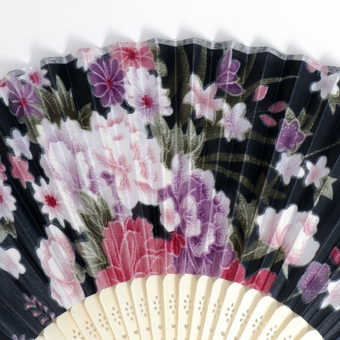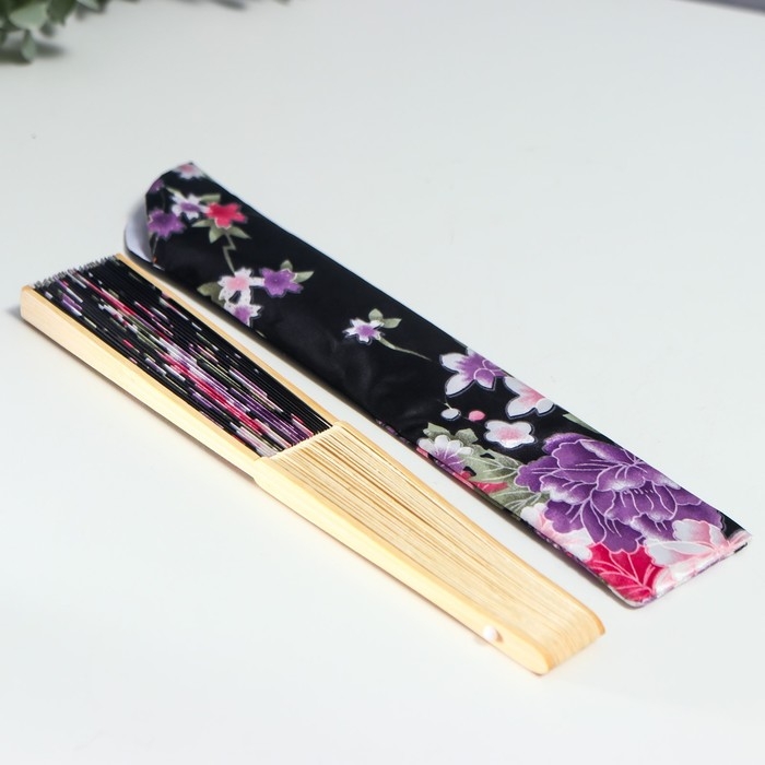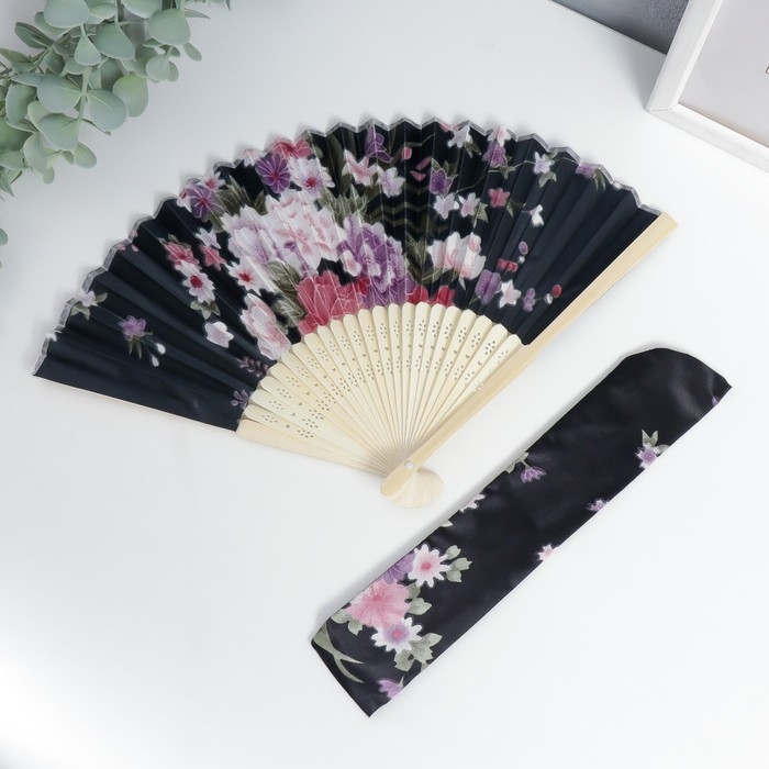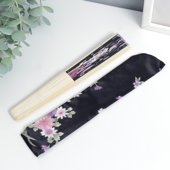 Веер бамбук, текстиль h=21 см "Цветы" с чехлом, чёрный