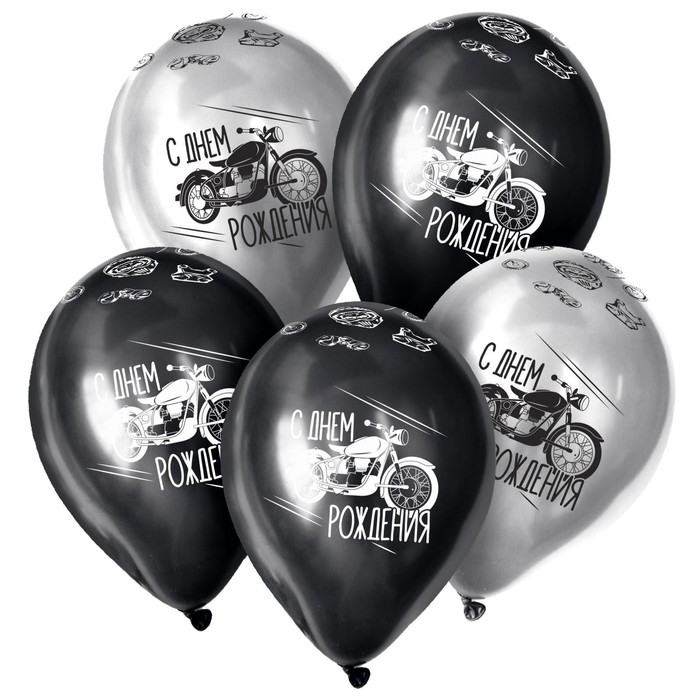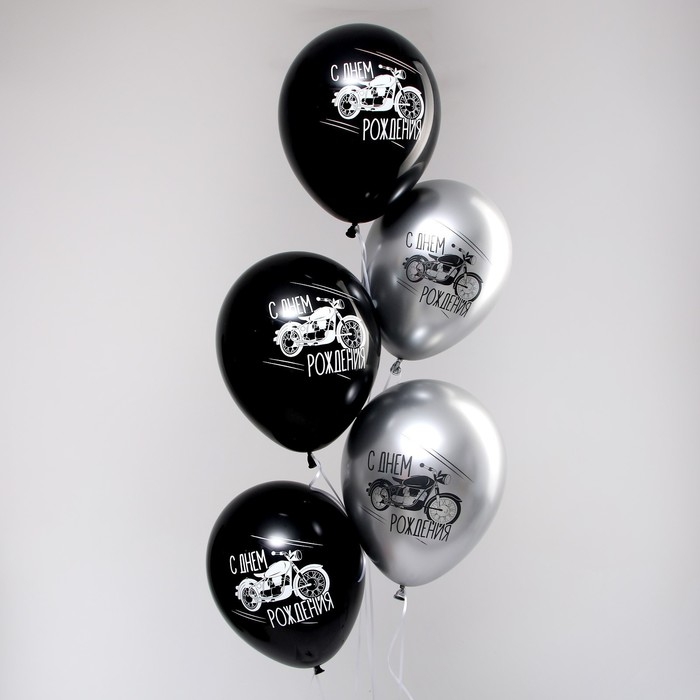 Воздушный шар латексный 12" «С днём рождения», цвет серебро хром, чёрный, 5 шт.