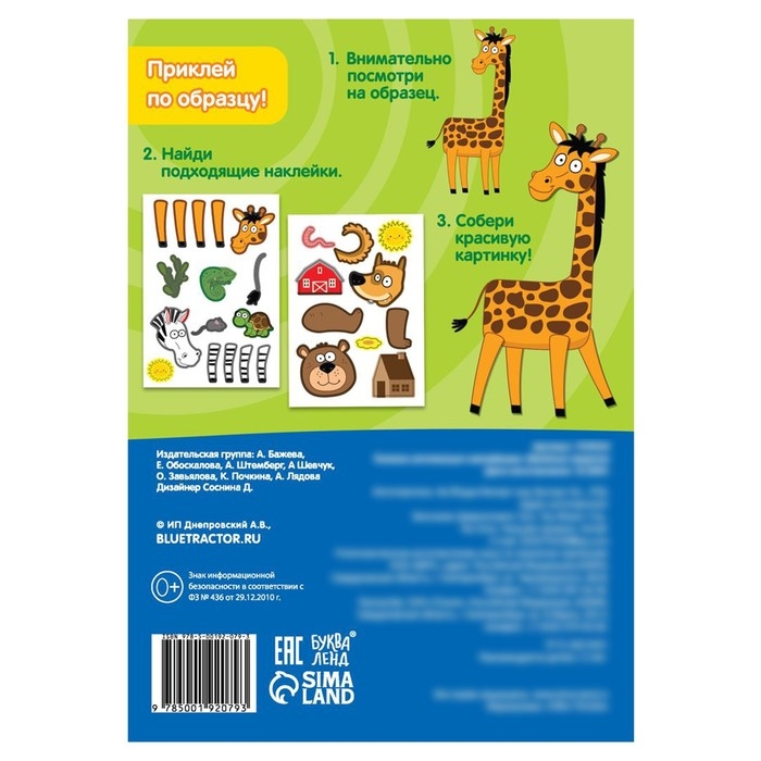 Внимательно посмотрите на образец, найдите подходящие наклейки и соберите весёлые картинки различных животных!
