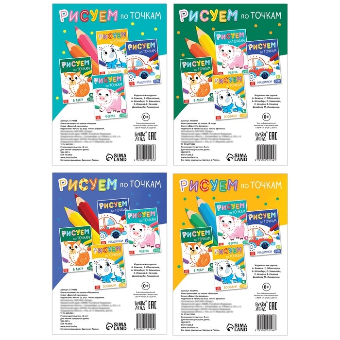 Набор книг для творческого развития «Рисуем по точкам» представлена четырьмя раскрасками с различными тематиками рисунков: