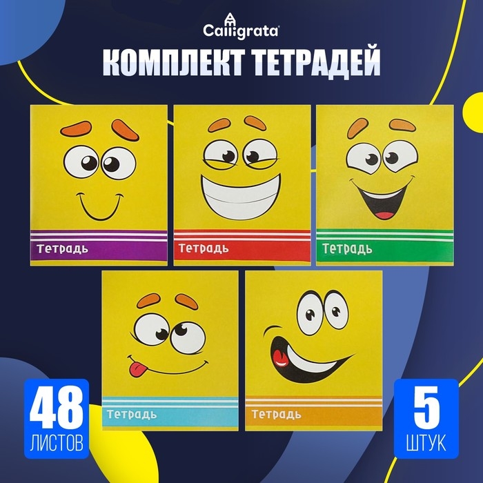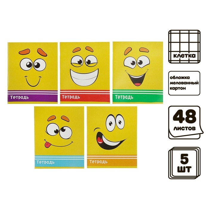 Комплект тетрадей из 5 штук, 48 листов в клетку Calligrata "Смайлики", обложка мелованный картон, блок офсет