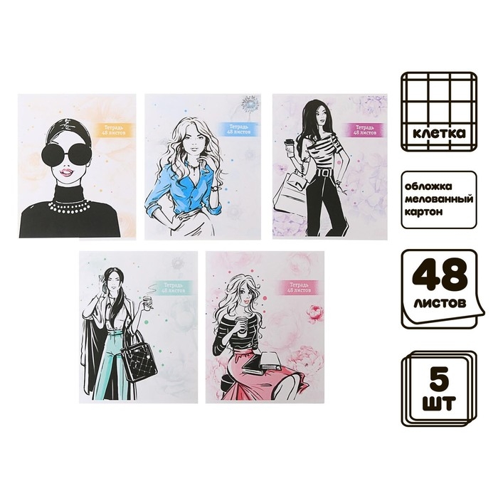 Комплект тетрадей из 5 штук, 48 листов в клетку Calligrata "Фэшн", обложка мелованный картон, блок офсет